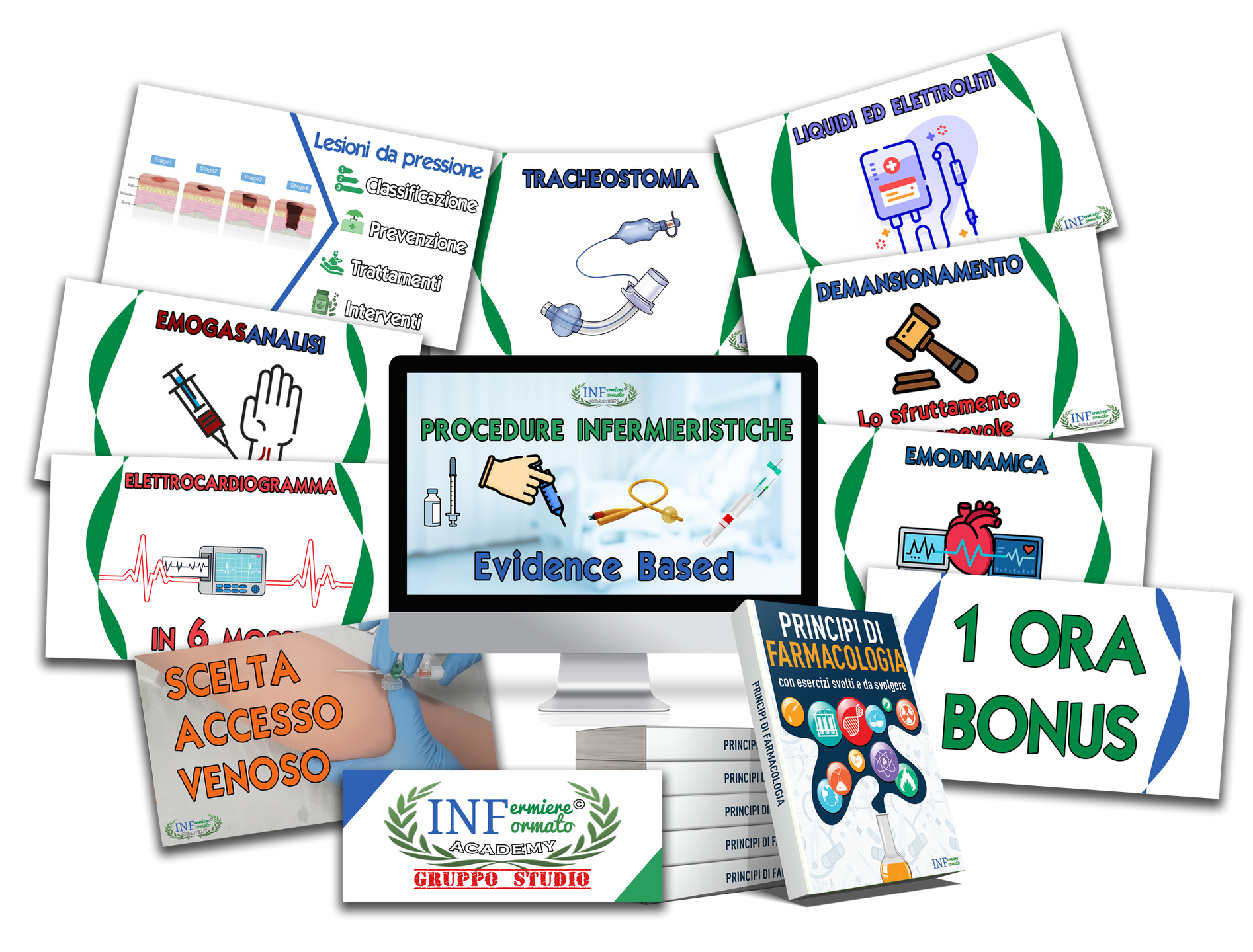 La versione Base di Infermiere Informato ACADEMY contiene tutto il modulo "Procedure infermieristiche Evidence Based" che già di per sé rappresenta un corso UNICO e in più ti da accesso a ben 3 BONUS, per un totale di 4 ore.